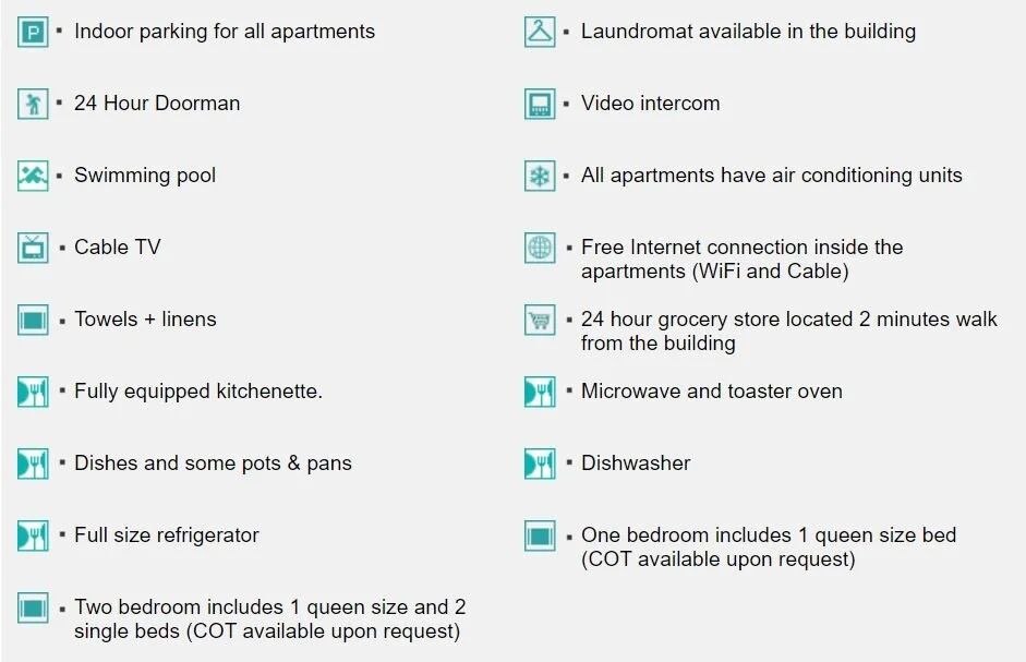 Feel at home in our apartments, using our fully furnished living room, dining room and bed rooms, equipped kitchen, and beautiful terrace. The one or two bedroom apartments are located in a 24 Hour Doorman building, which includes a full size lap swimming pool and is a two-minute walk from the beach. Our service Representatives will try to accommodate your needs (high chair, baby crib, Shabbos blech, cell phone etc.), so you can enjoy a warm, friendly and amiable stay in our apartments.